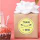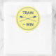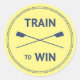 A motivational sticker for rowers and scullers with the caption "TRAIN TO WIN" in navy blue block capitals. The design has crossed oars, and dashed circles around the edge, all on a yellow background. Remind yourself of the purpose of the pain and the training!