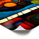 A.I .assisted print of a child in the foreground observes a vibrant, colorful scene features a whimsical train with children peering out from the windows against a backdrop of geometric buildings.