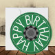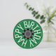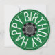 Say Happy Birthday in retro steam style with this round greetings card. The card is dark green with a design like a wheel, cog or gear, ideal for steampunk fans and vintage rail enthusiasts. The greeting 'Happy Birthday' appears in stylish retro lettering, in white, in a circle around the edge of the design. Steel and charcoal grey details add to the vintage industrial theme. The back of the card has plenty of white space for your own individual message.
