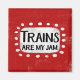 "Trains Are My Jam" is a fun text design with a white accent shape surrounded by white whimsical textured dots.