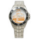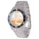 Has heft and feel of expensive stainless steel quartz watches. Good band with safety catch. I removed links, which is easy because engraved arrows show direction to push the linking pins. As always by this seller, the image (a railroad logo) is a perfect reproduction of my emailed image, and is precisely spaced and aligned.