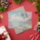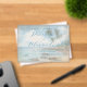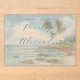 This elegant wedding invitation features a serene beach scene with palm trees and a soft blue sky, creating a tranquil tropical vibe. The muted blues, greens, and sandy beige tones evoke a peaceful atmosphere, enhanced by the watercolor painting technique that gives the design a dreamy quality. The layout is vertically orientated with centrally aligned text in an elegant script font for names and a classic serif font for details, ensuring a formal and romantic theme. Perfect for couples seeking a sophisticated yet relaxed celebration, this invitation sets the tone for a memorable event with its representation of a coastal landscape.