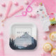 This wedding plate features a serene nature-inspired design with a watercolor-style mountain landscape in soft blue, gray, pink, and purple hues. The composition includes silhouetted pine trees at the bottom, creating depth against the dreamy sky. Central to the design is customizable text framed by a double-lined border, using bold serif fonts for names and a cursive script for "and," set against a calming backdrop. The overall style blends realism and impressionism, evoking a peaceful and romantic mood perfect for celebrating your special day.