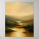 A serene and ethereal oil painting depicting a tranquil lake nestled between soft, rolling hills. The sky is a warm golden and amber hue, casting a gentle glow that reflects perfectly on the still water below. The misty atmosphere blurs the distant landscape, creating a dreamlike quality and a feeling of peace and solitude. The brushstrokes are soft and blended, emphasizing the harmony and quiet beauty of nature.