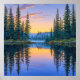 Peaceful evening scenery featuring a calm lake reflecting a forest of tall pine trees during a colourful sunset, evoking serenity and natural beauty in this picturesque setting.