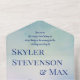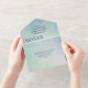 All in one wedding invitation with a beautiful and serene landscape in hues of seafoam green, blue, and violet as a background. Add the happy couple's names in a large deep blue font.