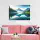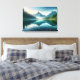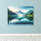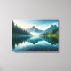 A serene mountain landscape painting depicting a glassy lake reflecting the dawn's light, featuring muted blues and rich green foliage. This artwork evokes tranquillity and a love for nature.