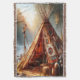 Nestled by a flowing river, a native Indian teepee stands proudly among lush trees and majestic mountains, inviting peaceful reflections and a deep connection with nature's beauty.