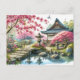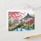 A serene Japanese garden during dusk, featuring a traditional wooden house with a gently sloping roof. Soft light emanates from the windows, casting a warm glow on the surrounding cherry blossom trees, which are in full bloom with vibrant pink flowers. A small stone path leads to an arched wooden bridge spanning a tranquil pond, reflecting the colourful landscape. Lanterns line the path, adding to the peaceful atmosphere, while delicate birds fly in the twilight sky. In the distance, more traditional structures are visible, adding depth to the scenic view.