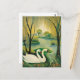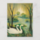 The image depicts a serene and picturesque scene featuring two swans gracefully sitting near a tranquil body of water. The setting is lush with weeping willow trees arching over the water, creating a natural frame. In the background, there is a small white structure, possibly a gazebo or pavilion, surrounded by greenery. The overall atmosphere is peaceful and idyllic, with a harmonious blend of nature and wildlife.
