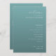 This elegant wedding program features a minimalist design with a calming teal background and crisp white text. The layout is clean and organized, showcasing the ceremony schedule in a simple sans-serif font that ensures readability. A mix of cursive and bold uppercase fonts highlights key elements like "welcome" and the names, adding a personal touch. Perfect for couples seeking a modern and understated aesthetic, this program conveys sophistication while keeping the focus on the special day's details.