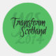 Green round sticker with 'transform Scotland' in the foreground and 'Yes 2014' in the background.