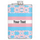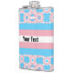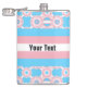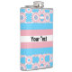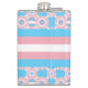 Vinyl-wrapped flask with the transgender pride flag and a seamless modern geometric flower pattern in the colours of the pride flag; a pink, white, and blue trans pride design on blue background with an editable text template for your name or message