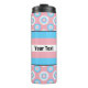 Thermal tumbler with the transgender pride flag and a seamless modern geometric flower pattern in the colours of the pride flag; a blue, pink, and white trans pride design on a pink background with an editable text template for your name or message