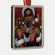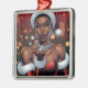 A Christmas ornament with a black trans woman blowing you a kiss in a pretty red dress and Santa hat in burgundy and gold.