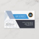 Over at the top there are three co-joined trapeziums that form a pathway to global success with your prestigious name and position leading the charge. The faux gold logo is towards its right. Directly underneath in a dark blue column lies the business name and contact details. At the bottom left corner, you have a slogan tagline to personalise your design.