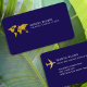 A modern and minimalist business card with basic information only... your name ('unica one' font style) with custom travel related occupation (travel consultant) and the image of a faux gold map of the world and a plane... and address, email and phone at the back... on dark blue background.