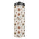 Travel mug with a pattern of brown and green foliage, featuring whimsical goats. The earthy tones create a rustic, nature-inspired aesthetic.