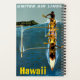 Vintage travel poster for United Air Lines to Hawaii, showing people paddling an outrigger canoe, circa 1960. In the background, Diamond Head and Waikiki Beach.