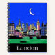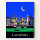 Journal in a vibrant cityscape of London is depicted under a starry night sky, with iconic landmarks like Big Ben silhouetted against the blue. A crescent moon hangs above the skyline, while a bridge crosses the river.