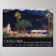 Vintage travel poster for tourism to Santa Catalina Island, California, showing a church and a plaza with a ship passing by in the distance, circa 1935