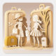 Travel stickers. Cardboard cutout-like illustration of children travelling with a huge suitcase and luggage. Weird. Fun.