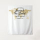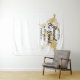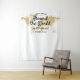 Custom Personalised "Around the World" theme Party Backdrop for a photobooth or selfie station at a travel theme birthday party with their name, age, and party or birth date printed on a soft fabric tapestry with our yellow gold colour world map. The type style is reminiscent of fonts used on vintage maps and old globes, but the design is simple so that your guests are the ones who shine in each photograph taken at the entryway of your event.