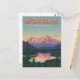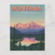 Vintage/Travel style art postcard, depicting a majestic scene of Montana, the 'Treasure State'. The landscape features snow-capped peaks glowing at sunset or sunrise, reflected in a tranquil lake, surrounded by deep green pine forests. Perfect for capturing the spirit of adventure and the wild beauty of the American West.