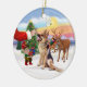 Santa offers his German Shepherd a treat while an elf helps load the sleigh.