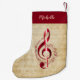 A beautiful, personalised music stocking featuring a red treble clef with music notes in a spiral staff, on top of a vintage beige piano sheet music background. A great gift for band, orchestra, or classroom music teachers, music students, or anyone who enjoys music!