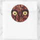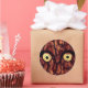 Features an owl made from treebark with big yellow eyes. Cute and rustic.
