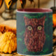 This design features cascading, layered soft green evergreen tree branches . It is embellished with an owl made from tree bark. In colours of hunter green brown and very dark black green. The simple, subtle beauty of nature with a touch of whimsy.