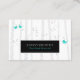 A business card with a modern yet sweet rustic unique design has a black background populated with birch trees and falling leaves.