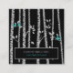 A business card with a modern yet sweet rustic unique design has a black background populated with birch trees and falling leaves.