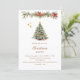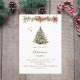 A winter invitation for a Christmas party. A white background on the front decorated with a watercolored hand-drawn pine tree with red and golden ornaments. Some stars and a Christmas decorated garland with cones and red Poinsettia flowers. Personalise and add your party details.