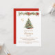 A winter invitation for a Christmas party. A white background on the front decorated with a watercolored hand-drawn pine tree with red and golden ornaments. Some stars and a Christmas decorated garland with cones and red Poinsettia flowers. Personalise and add your party details.