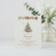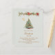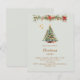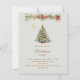 A winter invitation for a Christmas party. A soft, light sage green background on the front decorated with a watercolored hand-drawn pine tree with red and golden ornaments. Some stars and a Christmas decorated garland with cones and red Poinsettia flowers. Personalise and add your party details.