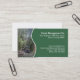 A business card template for forestry and timber companies with a photo of a blue harvester felling a conifer. On the front are the company name, address and contact details on a dark green panel separated from the photograph by a white wavy line. On the reverse is space for an employee's name and position, and any other information. This is on the white coloured card stock, with a customisable background colour on the reverse.