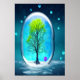 A tree inside a water and ice bubble with a purple ball with the dark night in the background. This is a AI generated art.