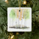 “A delicate watercolor scene of slender birch trees adorns this Christmas ornament, their white trunks and soft gray markings standing gracefully against a wash of gentle winter tones. Subtle hints of cool blues and muted greens evoke a peaceful forest moment, while the hand-painted style adds warmth and charm. A serene and elegant accent for any holiday décor.”