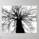 Photograph of a silhouette of an old tree with many branches in black and white.