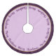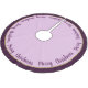 Holiday tree skirt is shown in a warm orchid and purple colour with purple text of Merry Christmas written in script all the way around the tree skirt with a solid colour border.