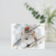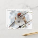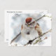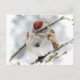 This postcard features a very cold American Tree Sparrow sitting on a branch, all fluffed up to stay warm during a snowstorm full of blowing drifting snow. His distinctive red cap and breast spot identify him as this species of sparrow.