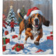 A spirited Treeing Walker Coonhound runs happily through the snowy winter scene, wearing a festive red Christmas hat. This lively design highlights the breed’s sleek coat, athletic build, and determined personality while capturing the warmth and joy of the holiday season. A heartwarming winter moment full of festive cheer.