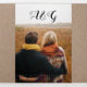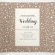 Trees and string lights on kraft paper rustic winter tri-fold wedding invtation. It features white trees and string lights on kraft paper on the cover and the outside flap. The inside includes your text on frames with snowflake pattern around them, while the outside back holds the photo and the initials of the couple.