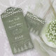 Trees and string lights on limed ash green all in one wedding invitation. It features white trees and string lights on green colour. The names are in script typography and the tear off RSVP card can be detached.
