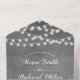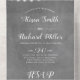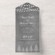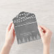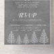 Trees and string lights on stained grey winter all in one wedding invitation. It features white trees and string lights on stained grey. The names are in script typography and the tear off RSVP card can be detached.