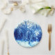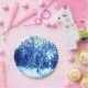 Paper plates in a Winter scene of snow-covered trees with a winter woodland background - digitally enhanced photography in shades of cobalt blue
