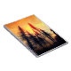 This notebook has a picture of trees at sunset pictured on it.