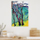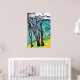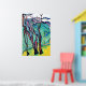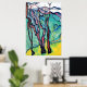 This modern abstract landscape features a beautiful scene with several trees standing in the mountain foothills with several mountains in the background. This colourful print features shades of blue, green, teal, yellow, brown, black along with a touch of red tones. This unframed print is available in various sizes to fit standard frames.